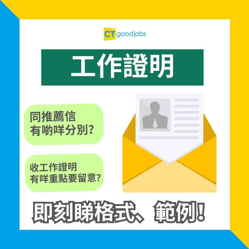 【工作證明 VS 推薦信有咩分別?】對於辭職的打工仔,不少人都提醒他們在離開公司前,要確保推薦信(Reference Letter)及工作證明(Letter of Employment)到手,才好來個華麗轉身。實際上,推薦信及工作證明有甚麼分別?工作證明有甚麼事項需要留意?CTgoodjobs今次為大家講解工作證明及推薦信的分別,同時為大家提供工作證明的格式與範例。